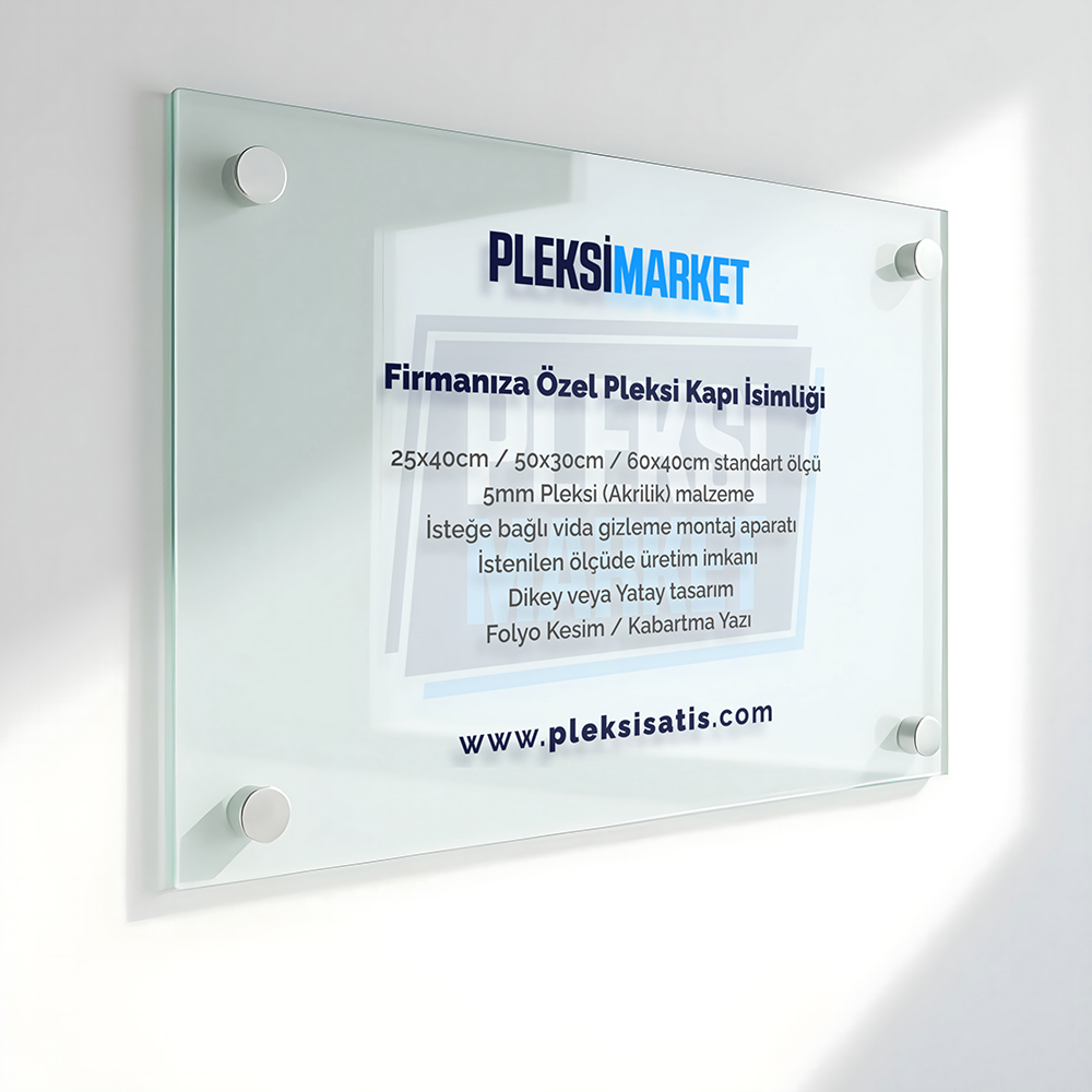 Bu model; “kurumsal kapı tabelası”, “büyük pleksi kapı levhası”, “akrilik kapı tabelası” gibi aramalarda hedeflenen profesyonel görünümü sağlar.